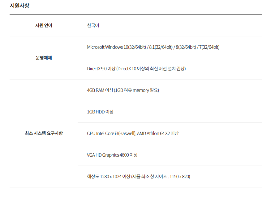 곰믹스 홈페이지에서는 아래와 같은 사양을 권장하고 있습니다.
